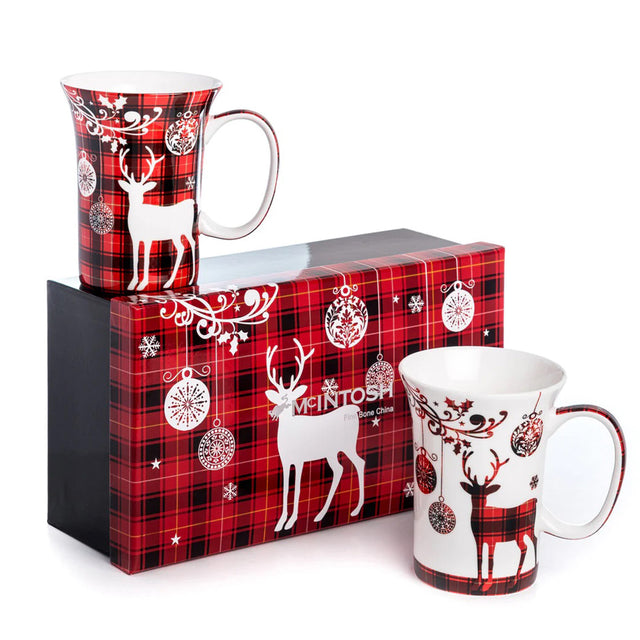 Bring the holiday spirit with your morning tea with these beautiful reindeer mugs. Festive contrast of red and white colors with reindeer and ornament designs. Packed in a beautiful red box and ready to be gifted away.